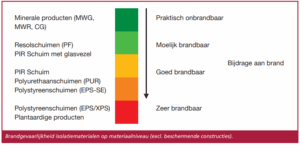 Globaal kan worden gesteld dat plantaardige producten het meest brandbaar zijn en een grote bijdrage hebben op branduitbreiding. Minerale producten zijn zo goed als onbrandbaar. Kunststof schuimen zitten er tussen in. Om het overzichtelijk te maken is er hieronder een overzicht van brandgevaarlijkheid per isolatiemateriaal.