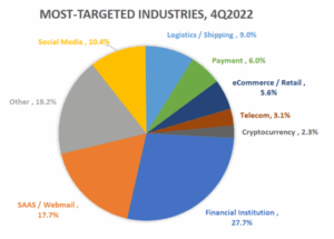 De cirkelgrafiek ‘most-targeted industries, Q4 2022’ toont het aantal phishingaanvallen per sector van Q4 2022. De financiële sector wordt het vaakst getroffen met 27,7%. Tot de financiële sector behoren o.a. banken, pensioenfondsen, verzekeraars en assurantieadviseurs.