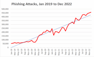 De APWG (De Anti-Phishing Working Group) toont in de grafiek ‘Phishing Attacks’ over de periode januari 2019 tot en december 2022 de explosieve stijging van het aantal phishingaanvallen. Binnen een periode van 3 jaar is het aantal verstuurde phishing-e-mails gestegen van 50.000 stuks naar 450.000 stuks, waarbij er een jaarlijkse stijging is van meer dan 150%.